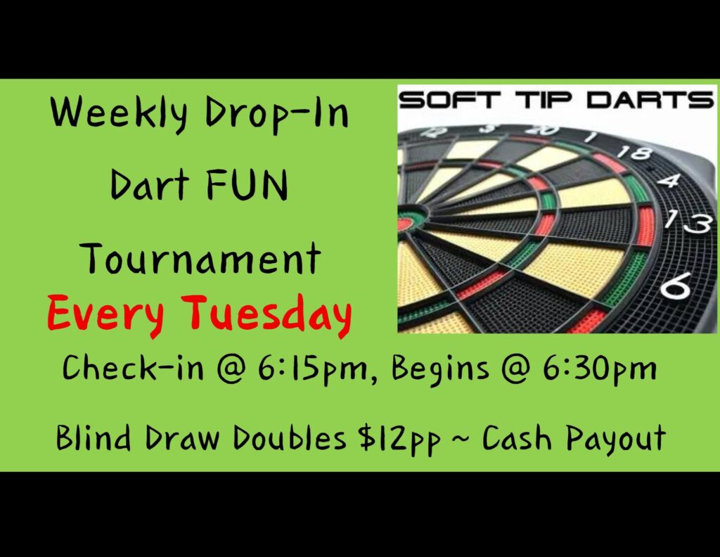 Join us for the Tuesday Blind Draw Doubles Tournament! Check-in starts at 6:15 PM. The entry fee is only $12 per person, which includes board fees. Matches will be played as best 2 out of 3, featuring 501 and Cricket. The tournament will consist of both a winners’ bracket and a losers’ bracket in a double elimination format. This event is for soft-tip dart players at an advanced beginner to intermediate level.